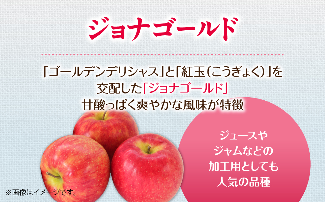 「ジョナゴールド」は、アメリカの「ゴールデンデリシャス」と「紅玉(こうぎょく)」を交配したりんごで、甘酸っぱく爽やかな風味が特徴です。そのまま食べてもすっきりとした酸味で美味しいですが、ジュースやジャムなどの加工用としても人気の品種です。