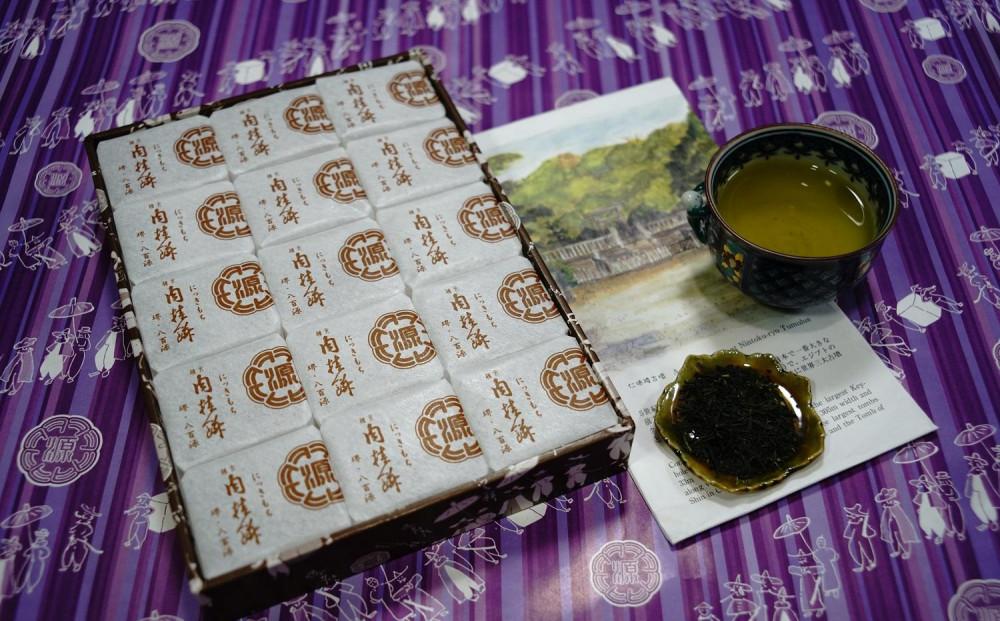 堺500年の伝統銘菓・八百源来弘堂謹製の元祖にっき餅と堺の老舗茶舗・松倉茶舗が調整しましたお煎茶のセットでございます。