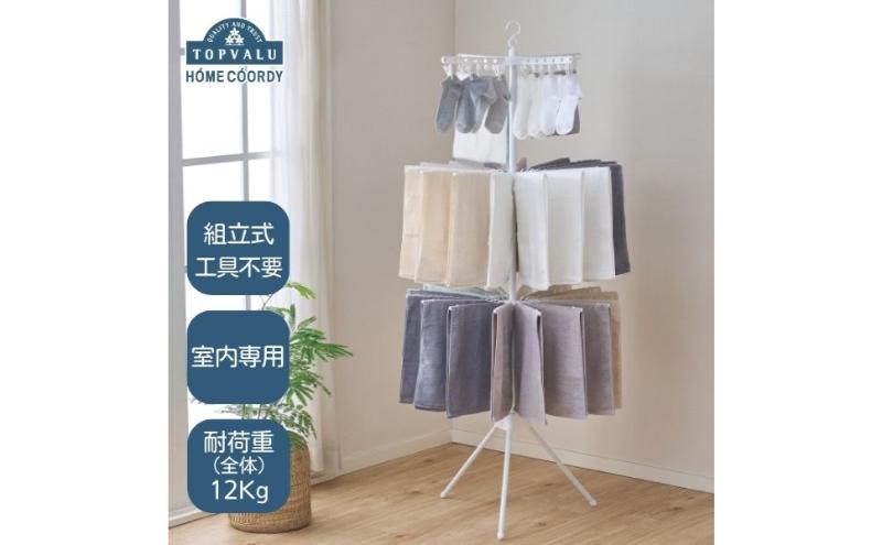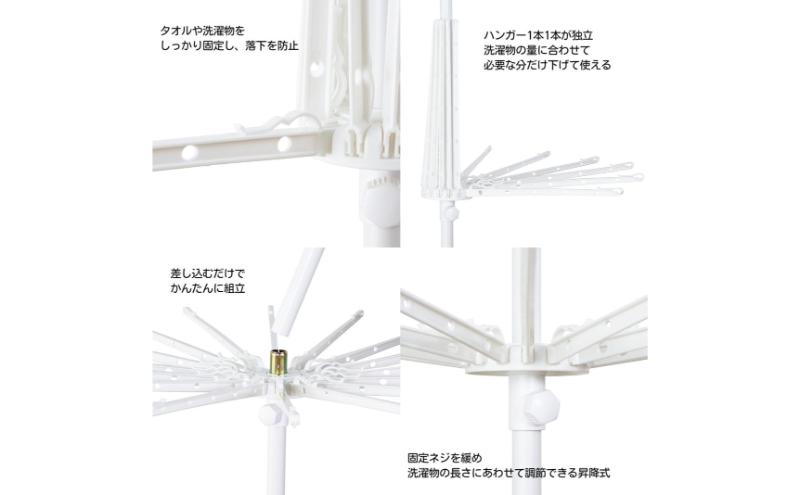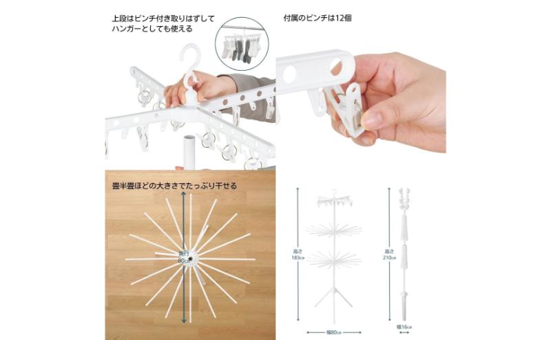 原産国 中国 / 材質 パイプ:スチール(粉体塗装)樹脂:ポリプロピレン、ABS 樹脂 / 商品サイズ 使用時:幅80×奥行き80×高さ183cm 収納時:幅16×奥行き16×高さ210cm / 製品重量 1.6kg / 耐荷重 全体:12kg ピンチハンガー:4kg タオルハンガー:8kg(アーム1本あたり250g ×32本)