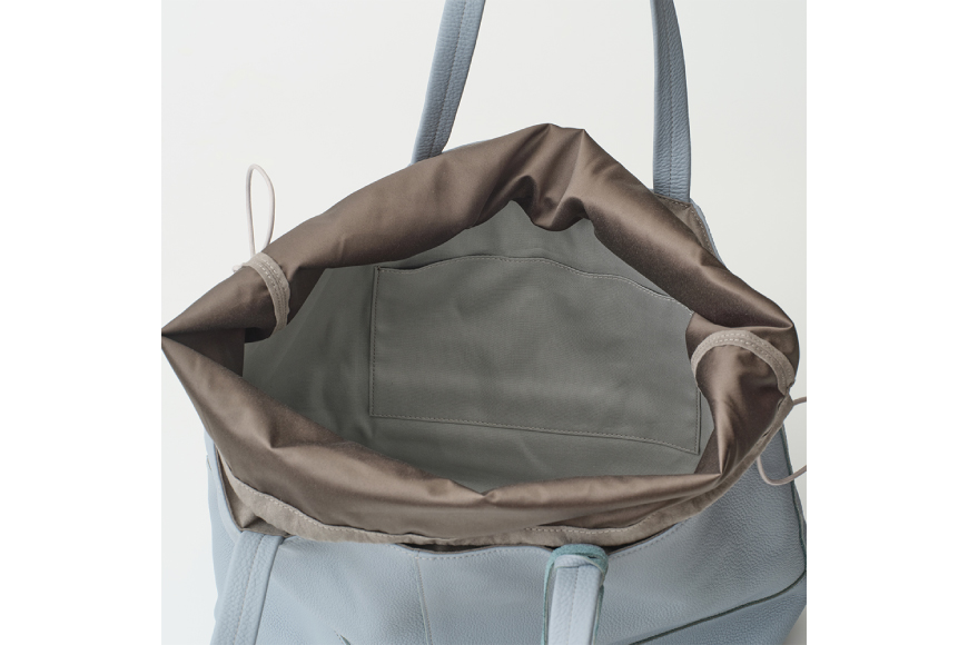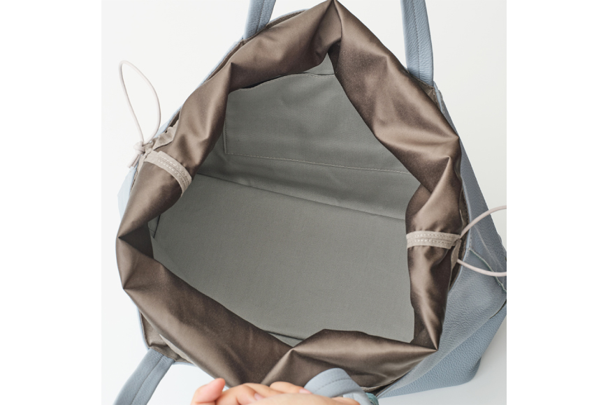 開口部は巾着仕様になっていて、紐をしぼらないときはオープントートとしてお使いいただけます。