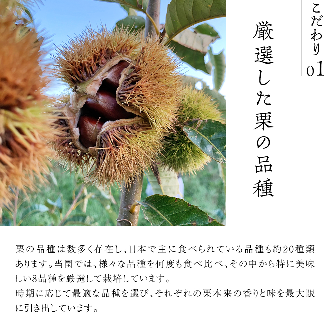 栗の品種は数多く存在し、日本で主に食べられている品種も約20種類あります。当園では、様々な品種を何度も食べ比べ、その中から特に美味しい8品種を厳選して栽培しています。時期に応じて最適な品種を選び、それぞれの栗本来の香りと味を最大限に引き出しています。