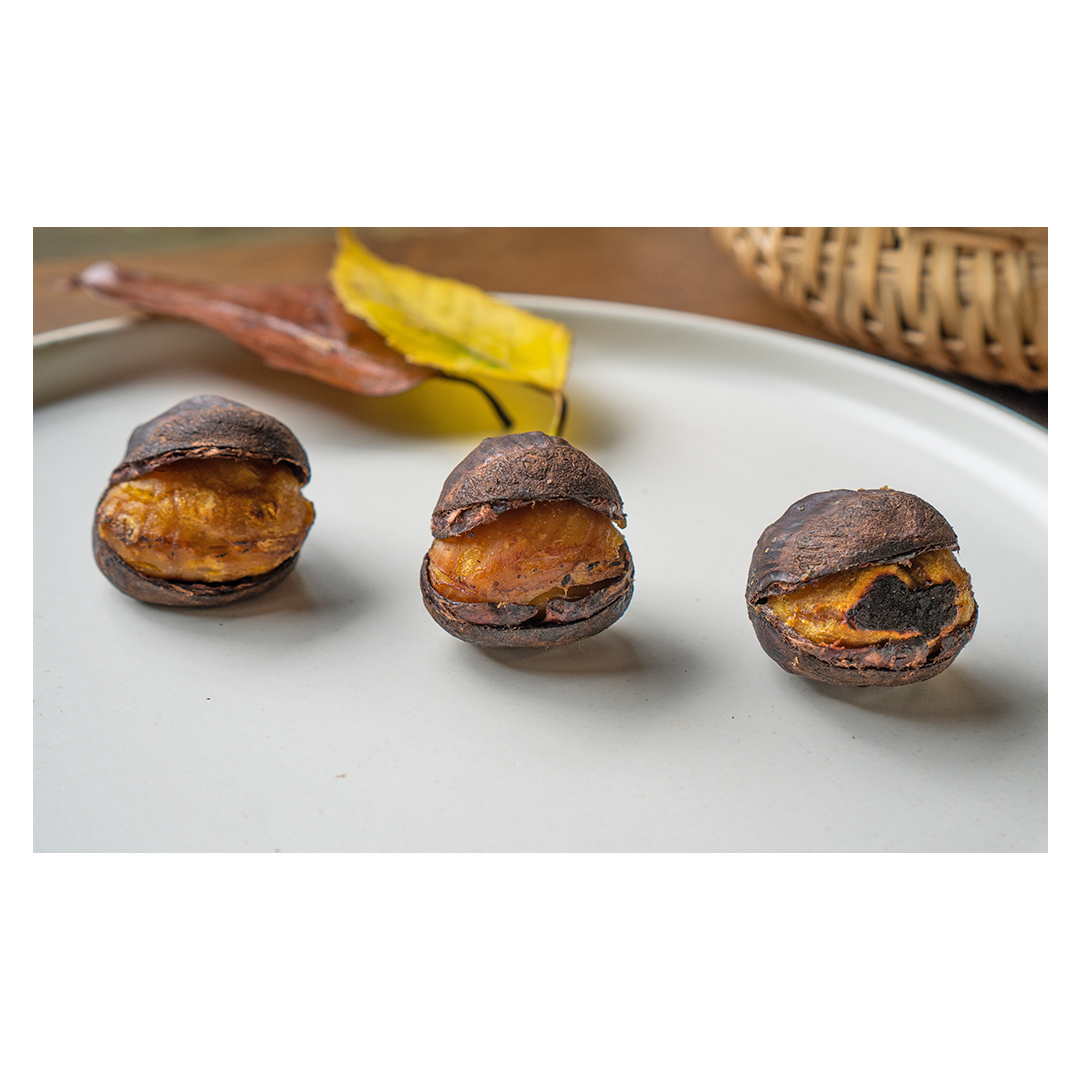 栗の主成分であるデンプンは、熟成することで糖に変わり甘みが増します。当園では、この熟成工程を妥協せずに行い、文献データに基づき糖度が最大になるまで熟成させます。専用の冷蔵庫で高湿度を保ちながら熟成させることで、しっとりとした甘みのある焼き栗に仕上げています。