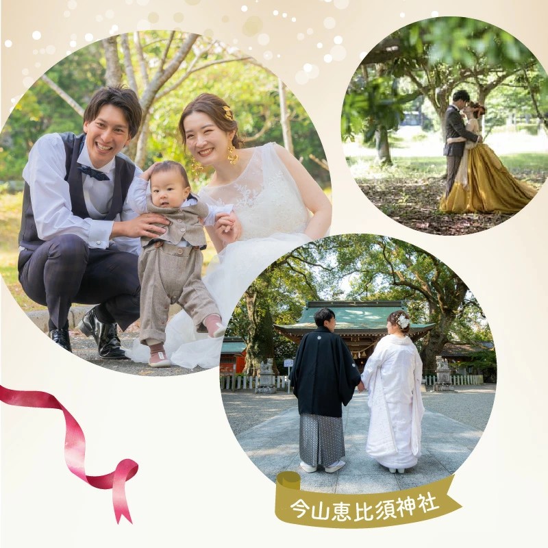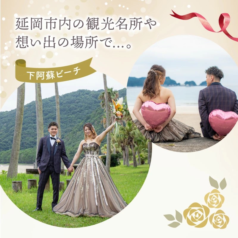 延岡市内の観光名所(音楽ライブイベントが行われるサンビーチすみえ・九州三大恵比須神社の一つである今山恵比須神社)など想いでの場所や市内近郊で会いたい方の元へタキシードとウエディングドレスで訪問撮影ができます。