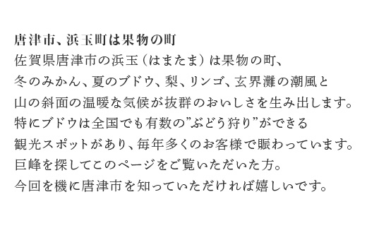 巨峰を探してこのページをご覧いただいた方。今回を機に唐津市を知っていただければ嬉しいです。