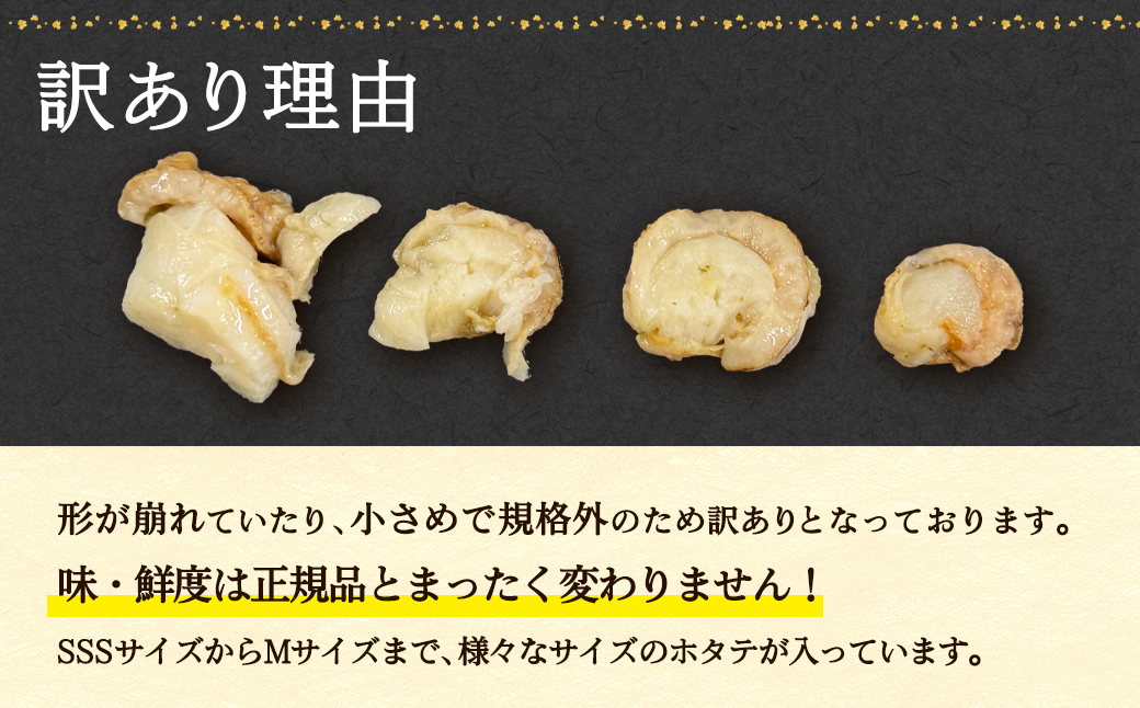 (一袋の中におおよそSSSサイズからMサイズまで様々な大きさのボイルホタテが入っています)