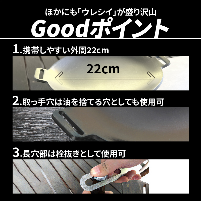 携帯性を考慮し外周は22cmにしました。 油が自然に真ん中に集まるので油垂れも安心です。