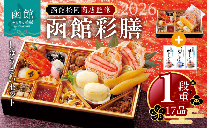 函館ならではのおせち「函館彩膳 1段重(17品)」と「しゅうまい(3種)」のセットです。