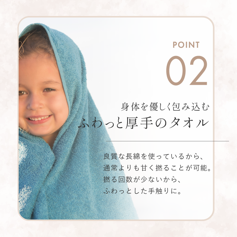 繊維が長く、撚りの回数を少なくすることで、肌に触れたときにとてもやわらかく、水分を優しく吸い取ってくれます。