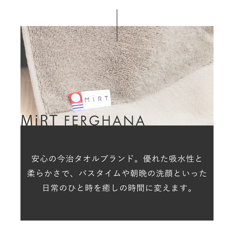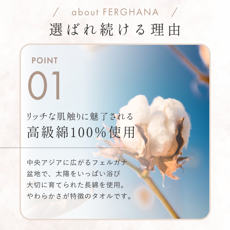 中央アジア、フェルガナ盆地で栽培された長綿を甘撚りにし、やわらかさと吸水性のあるタオルに仕上げました。