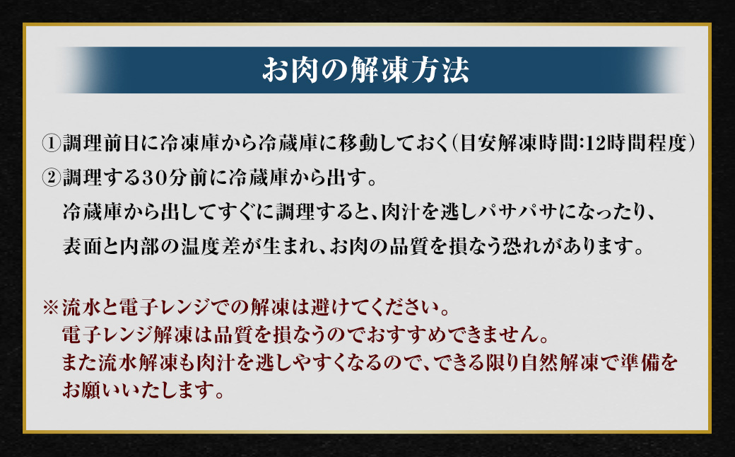 また流水解凍も肉汁を逃しやすくなるので、できる限り自然解凍で準備をお願いいたします。