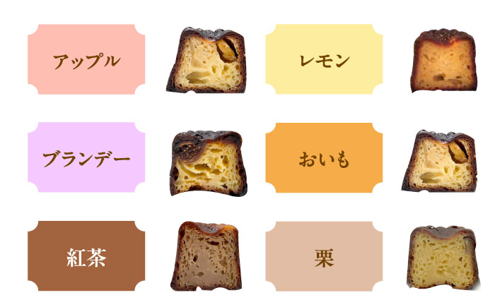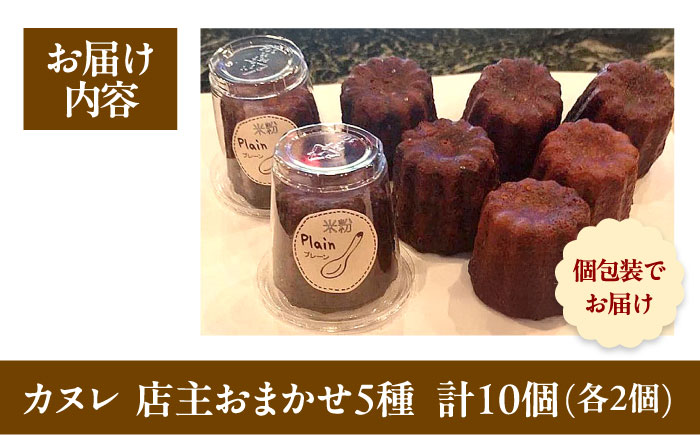 全10種類のカヌレの中から、その時おすすめの5種類をランダムにセレクトし、各2個ずつ(計10個)詰め合わせてお届けします。