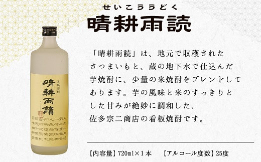 「晴耕雨読」は、地元で収穫されたさつまいもと、蔵の地下水で仕込んだ芋焼酎に、少量の米焼酎をブレンドしてあります。芋の風味と米のすっきりとした甘みが絶妙に調和した佐多宗二商店の看板焼酎です。