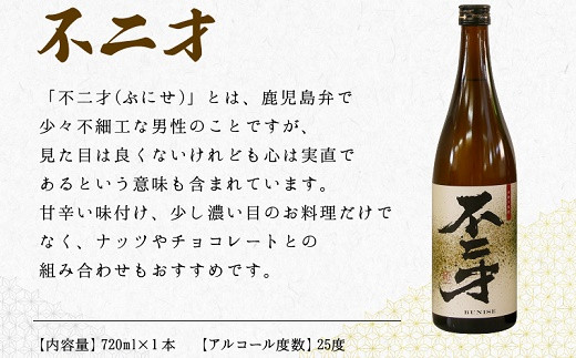 「不二才(ぶにせ)」とは、鹿児島弁で少々不細工な男性のことですが、見た目は良くないけれども心は実直であるという意味も含まれています。甘辛い味付け、少し濃い目のお料理だけでなく、ナッツやチョコレートとの組み合わせもおすすめです。