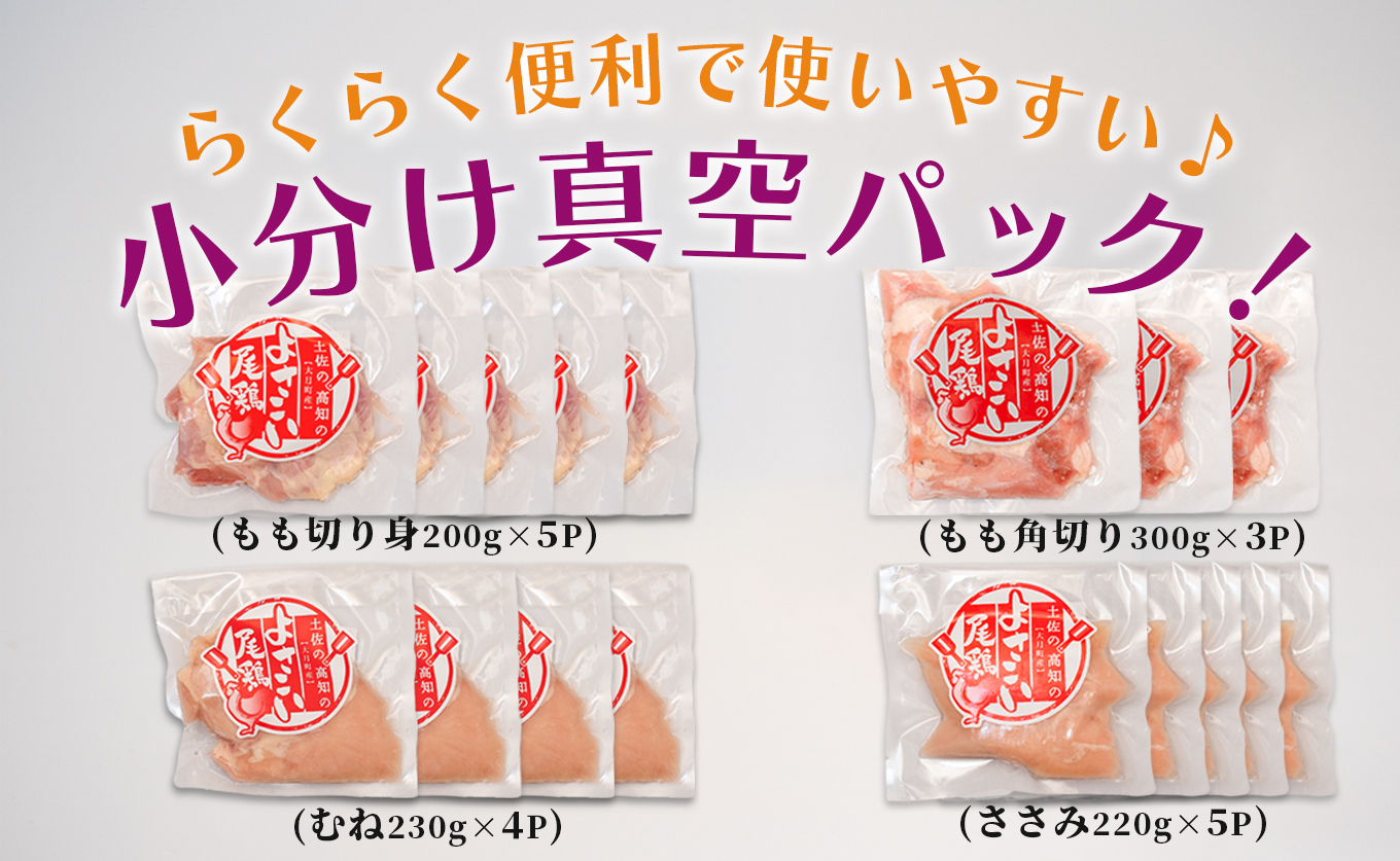さばきたてのよさこい尾鶏を急速冷凍することで、処理したての美味しさを保ち、使いやすさを考えて、小分けにしたパッケージでお届けします。