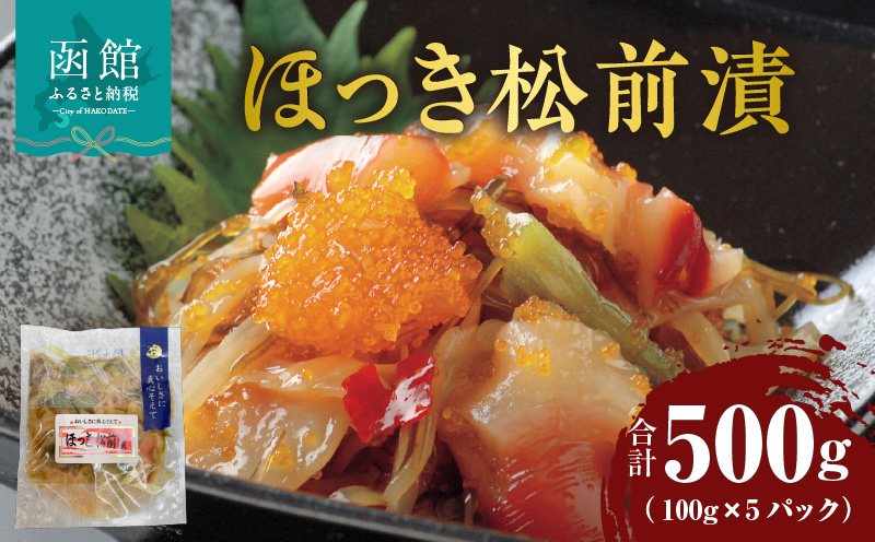 白醤油ベースの松前漬けにほっき貝を混ぜ合わせ漬け込みました。ほっき貝の旨味も堪能いただける贅沢な一品。山くらげ入りで食感も良いです。1パック100g入を5パックでお届け。小分けですので、食べる分だけ解凍してお召し上がりいただけます。
