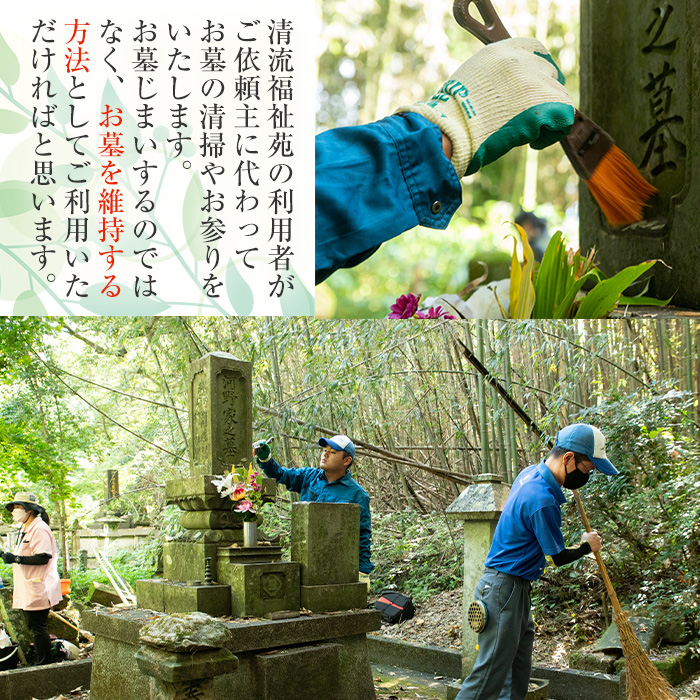 社会福祉法人清流苑が平成28年からスタートさせた「墓守(はかもり)サービス」です。寄附者様に代わって、ふるさと出水に暮らす私たち社会福祉法人清流苑の職員・利用者がお墓の清掃、お参りをお手伝いします。作業は1時間でできる範囲のみとさせていただきます(敷地内清掃、花立の水替え等)。作業後は実施報告書をお送りします。