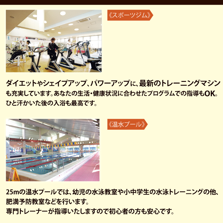 25mの温水プールでは、幼児の水泳教室や小中学生の水泳トレーニングのほか、肥満予防教室などを行います。