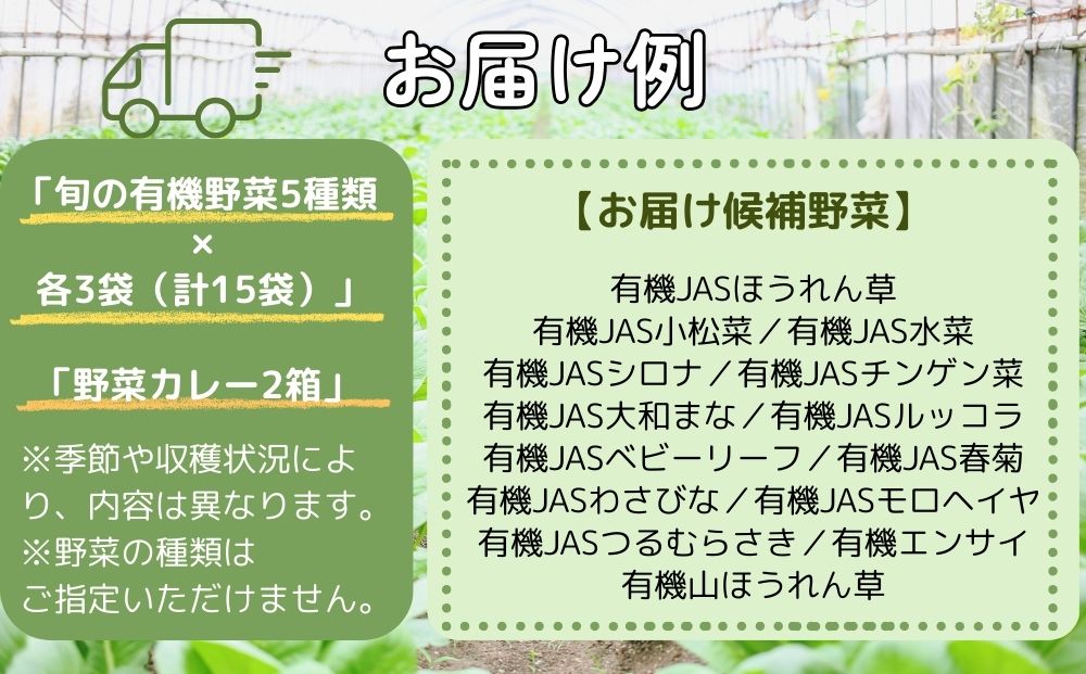 月1回:生産者チョイスセット 5種類各3袋 合計15袋 +カレー2箱 ※旬の野菜をお届けしますので、野菜の指定は出来兼ねます。 【原材料】 野菜 :有機野菜 カレー:野菜(人参、じゃがいも、玉ねぎ、大根)、鶏がらスープ、しめじ、ソテーオニオン、リンゴピューレ、小麦粉、トマトケチャップ、おろしにんにく、植物油脂(菜種)、砂糖、バター、カレー粉、醤油、おろししょうが、食塩、クミン、コリアンダー、大和まな粉末/カラメル色素(一部に小麦・乳成分・鶏肉・りんご・大豆を含む)