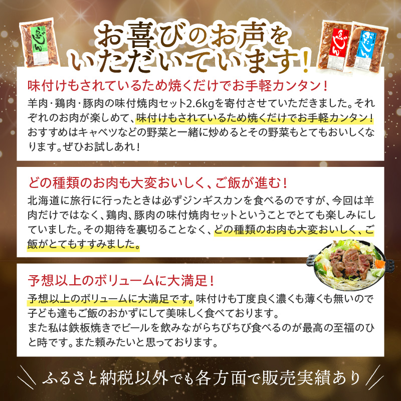 ●味付羊肉(らむじん):羊肉(オーストラリア産)、醤油ダレ(醤油、砂糖、玉葱、リンゴ、調味料(アミノ酸等)、カラメル色素、その他)、味噌ダレ(醤油、味噌、砂糖、玉葱、リンゴ、調味料(アミノ酸)、カラメル色素、その他)