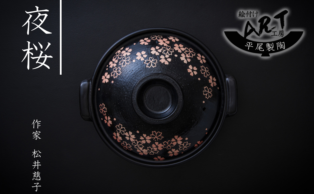 萬古焼の土鍋“夜桜”は、漆黒の器に咲き誇る桜が美しい、情緒あふれる作品です。