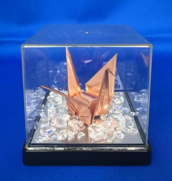 この作品は、折り紙の鶴を銅の板で制作しています。そのままですと怪我をする恐れがあるため、ケースに入れてあります。