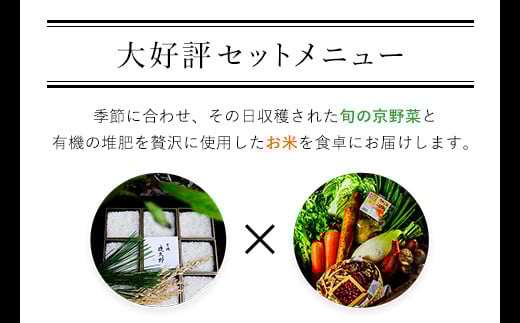 有機肥料で栽培したこだわりのお米と、季節に合わせ、その日収穫された旬の京野菜を食卓にお届けします。