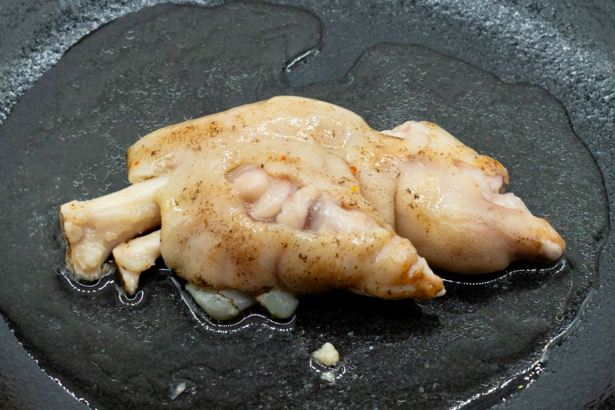 豚足(国産)、食塩、にんにく、香辛料、小麦粉、大豆たん白、卵たん白/調味料(アミノ酸)、増粘剤(キサンタンガム)、(一部に卵・乳成分・小麦・大豆・豚肉を含む)