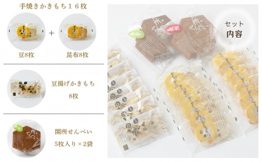 - ・手焼きかきもち 16枚 (豆8枚、昆布8枚) ・豆揚げかきもち 8枚 ・関所せんべい 5枚入×2袋