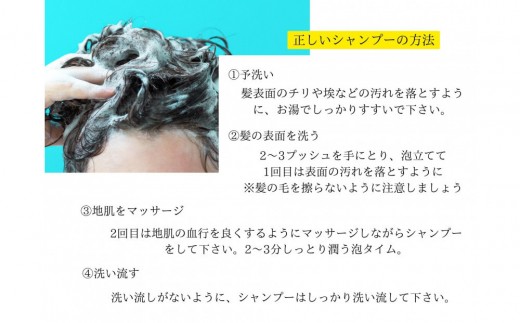 2.適量を手にとり、1回目は表面の汚れを落とすようにシャンプーして下さい。2回目は地肌の血行を良くするようにマッサージしながらシャンプーをして下さい。目的が違うので2回シャンプーすることをおすすめします。シャンプーはしっかり洗い流して下さい。