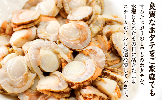 甘みたっぷりの1年物ホタテを活きたままスチームボイルし、急速冷凍しています。