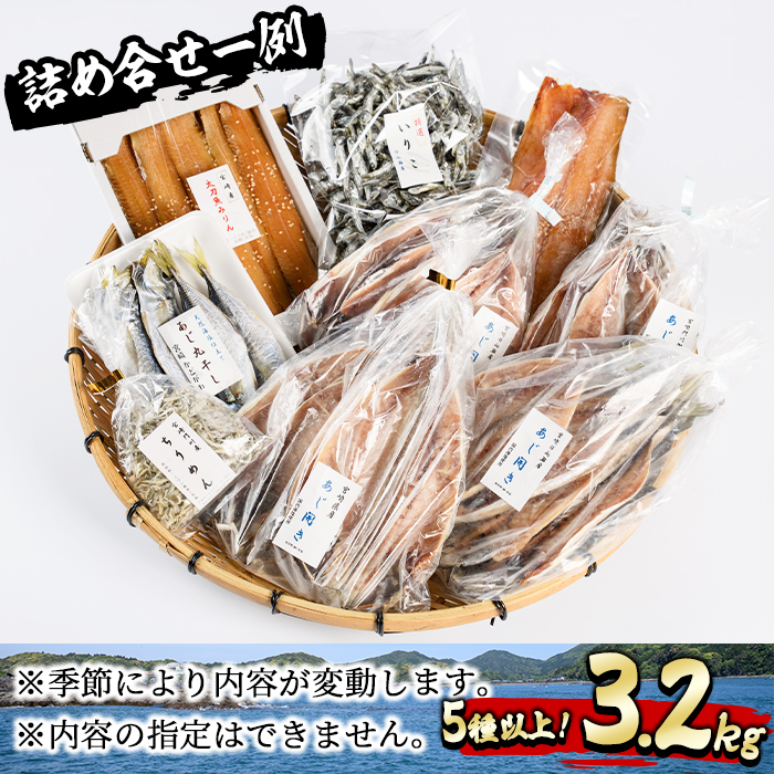 5種類以上 3.2kg以上をお届け<br>【内容例】<br>アジの開き<br>ちりめん<br>うるめ丸干し<br>さばみりんフィレ<br>カマス開き<br>真アジ開き<br>アジ丸干し<br>さごしフィレ<br>めひかり丸干し<br>食べるいりこ<br>釜揚げしらす など<br> <br>季節により内容が変動します。<br>※内容の指定はできません。