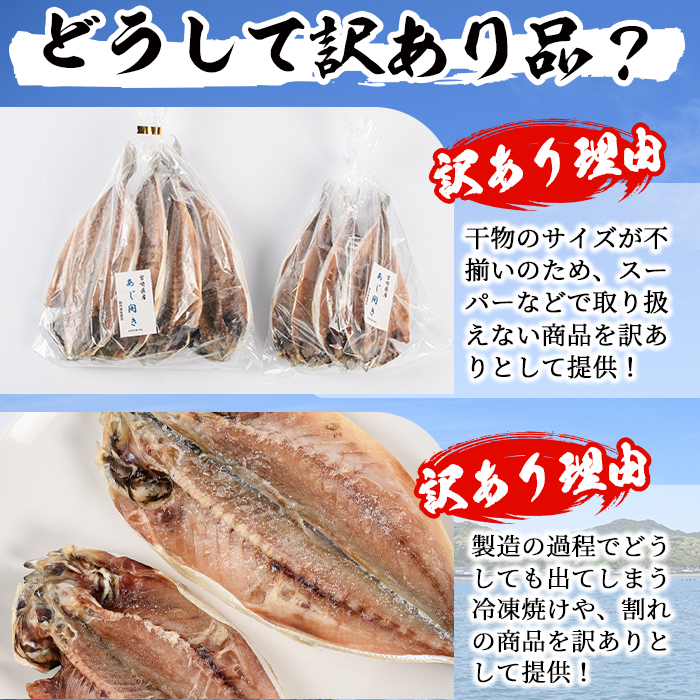 明治時代から続く老舗岩田水産の干物5種類をボリュームたっぷり3.2kg以上お届け。日向灘の黒潮に育まれたミネラルやカルシウムたっぷりの海の幸を干物にしています。干物へ加工する際にできたキズや、コロナの影響による販路減少。これらの理由で正規品として出せない干物を訳ありセットにしました。朝ごはんの一品や夕食のおかずとしてお楽しみいただけます。訳あり品ですが、品質には全く問題ありません。安心してご賞味ください!※保存料、合成着色料は全て不使用。ほとんどの商品が化学調味料不使用です。賞味期限:3ヶ月提供元:岩田水産