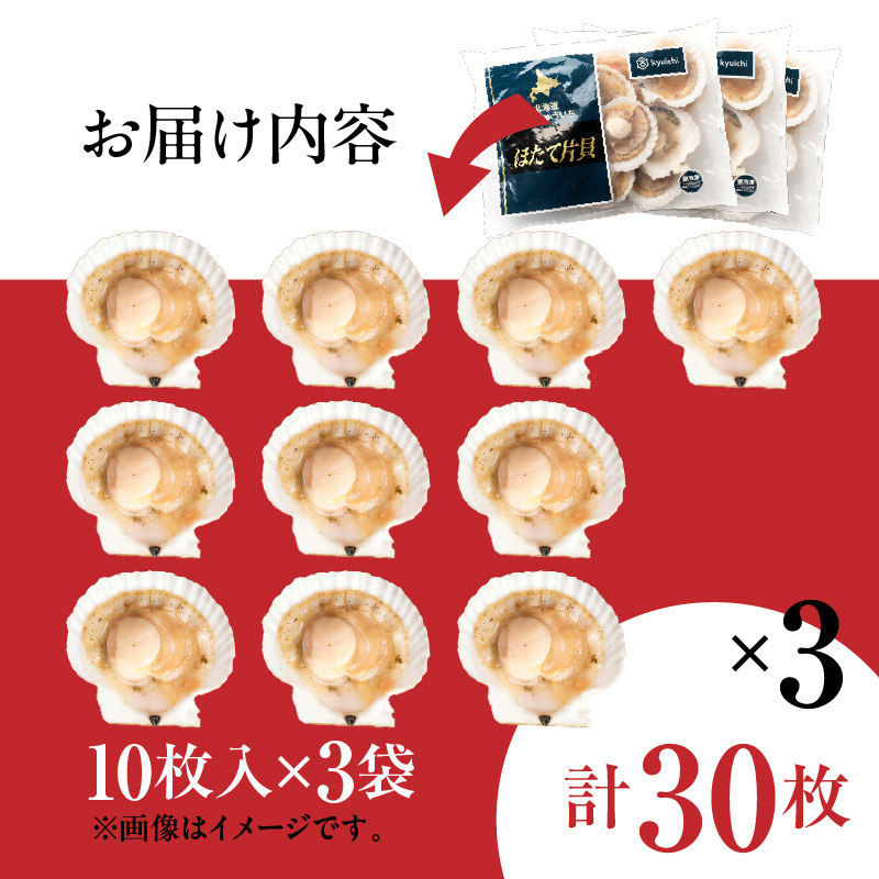 北海道噴火湾産ホタテ片貝 Mサイズ (1枚 8〜9cm)/10枚×3袋【計30枚】