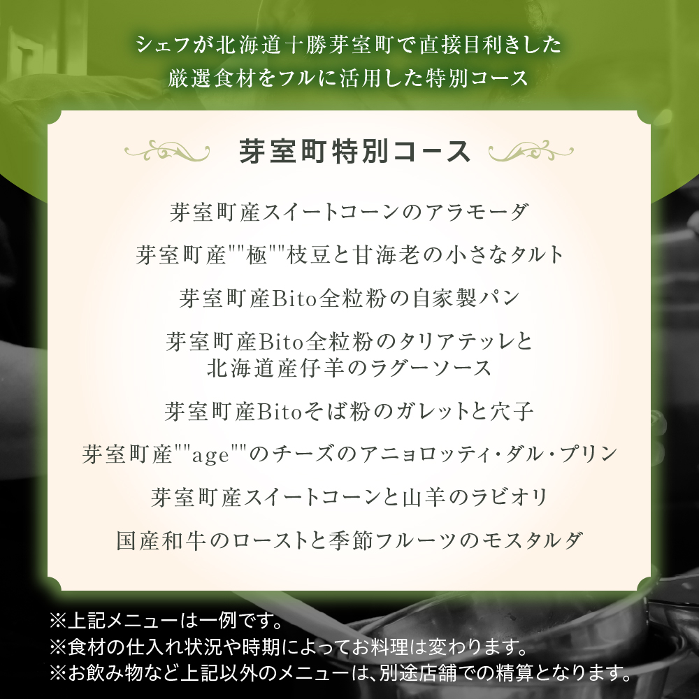 本コースは、シェフが芽室町の一次生産者の現場を訪れ、目利きした厳選食材をフルに活用した特別コースです。