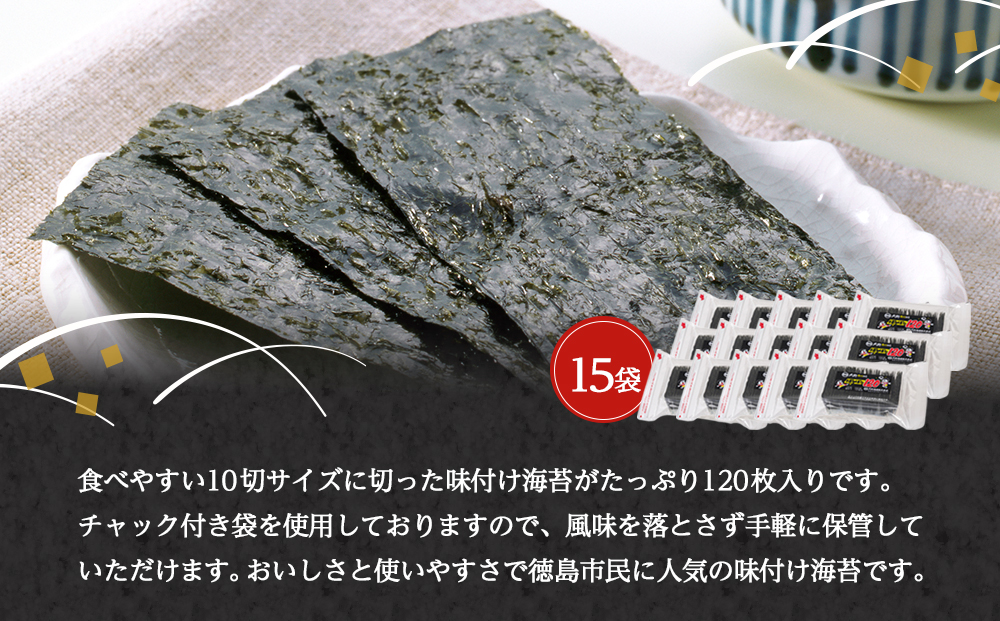 食べやすい10切サイズに切った味付け海苔がたっぷり120枚入りです。