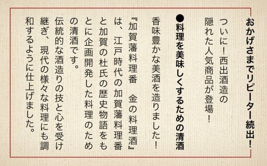『加賀藩料理番 金の料理酒』は、江戸時代の加賀藩料理番と加賀の杜氏の歴史物語をもとに企画開発した料理のための清酒です。