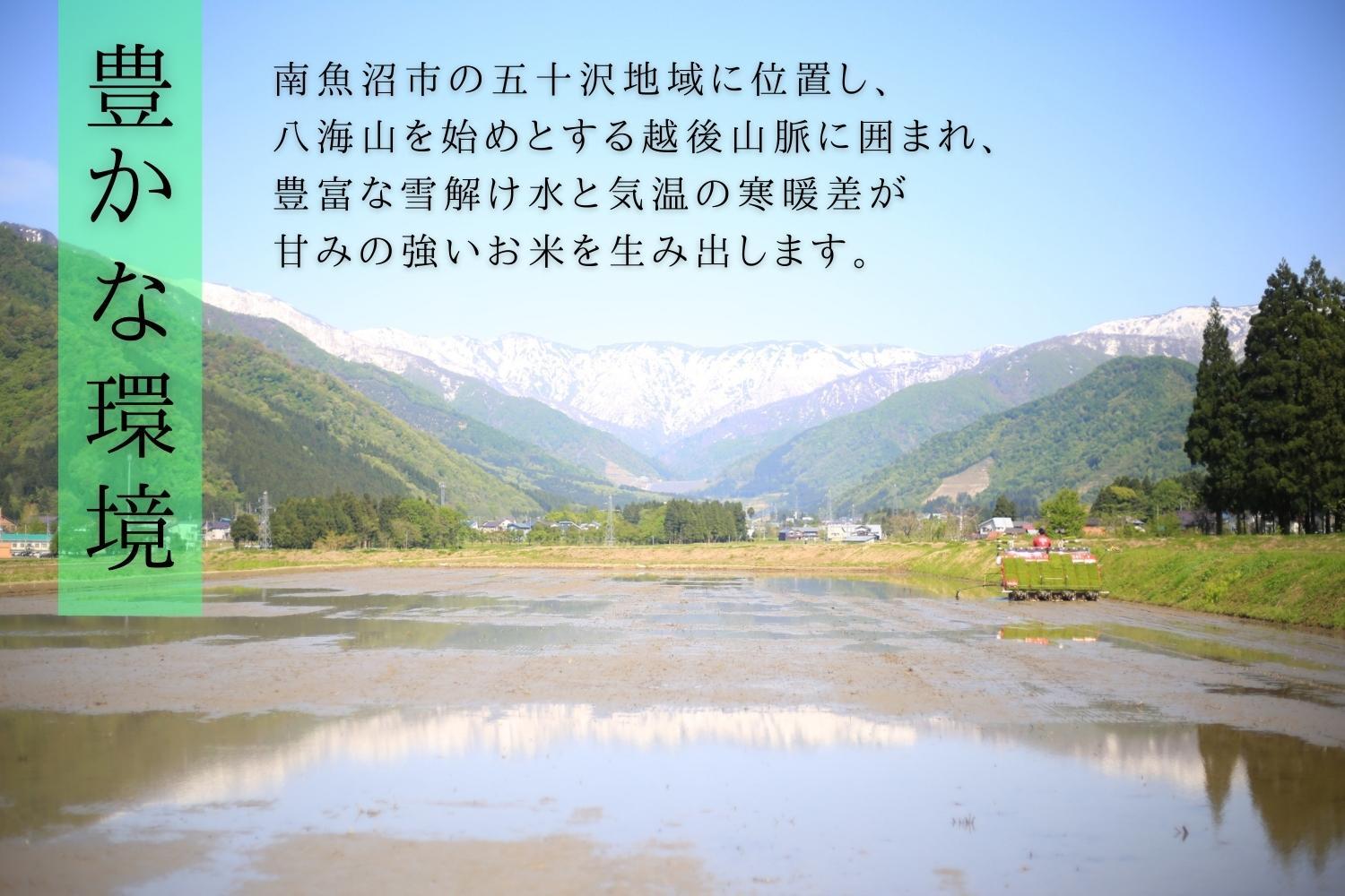 米どころ新潟の中において、トップブランドに位置づけされる魚沼産コシヒカリ。その中でもさらにおいしいといわれている南魚沼市の五十沢地区に当農場があります。八海山を始め、二千m近い山々が連なる越後山脈に囲まれ、豊富な雪解け水と日中の大きい寒暖差が良品質・良食味のお米を生産することができます。