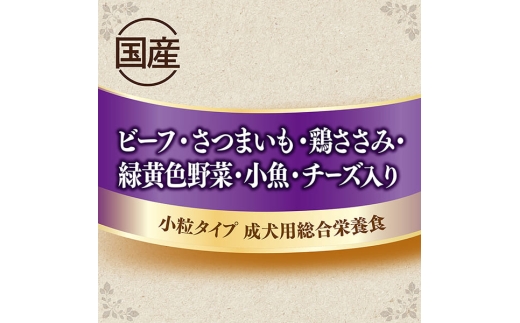 - ・商品タイプ ソフト ・内容量 1.7kg×4袋 ・フレーバー ビーフ・さつまいも・鶏ささみ・緑黄色野菜・小魚・チーズ・角切りビーフ粒入り