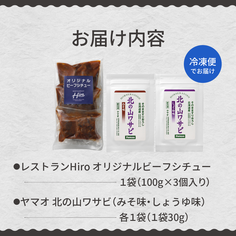 ビーフシチュー100g×3個セット、北の山ワサビ/みそ味・しょうゆ味(30g各1個)