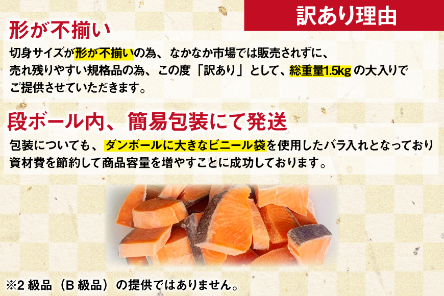 ![訳あり 無添加 サーモン 【お弁当用】 切身 骨取り 無塩 1.5kg バラ入れ 大袋 [足利本店 宮城県 気仙沼市 20565153] 魚 魚介類 サーモン 冷凍 鮭 海鮮 魚介 規格外 不揃い さけ サケ 鮭切身 シャケ 切り身 サーモン切り身 訳アリ わけあり 簡易包装 家庭用 冷凍](https://www.furusato.aeon.co.jp/g_img/042056/file_35413b062590fe1e3d6cdfb54fcb244d.webp)