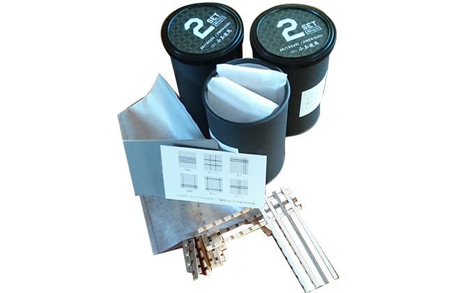 天然秋田杉と神代杉を使用した、20本の切り込みの入った組子。黒っぽい埋木をアクセントとして自分で組立てて作ることができます。指先を使うので子供さんも大人も楽しめます。