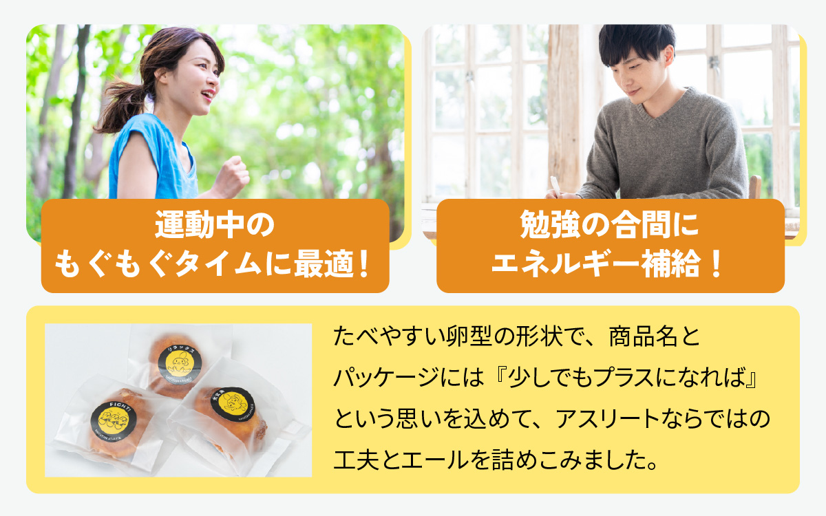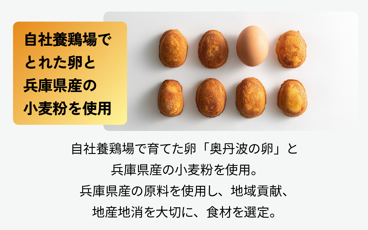 自社養鶏場でとれた卵「奥丹波の卵」と兵庫県産の小麦粉を使用。兵庫県産の原料を使用し、地域貢献、地産地消を大切に、食材を選定。たべやすい卵型の形状で商品名、パッケージにはエールを込めて。アスリートならではの工夫と想いを詰めこみました。