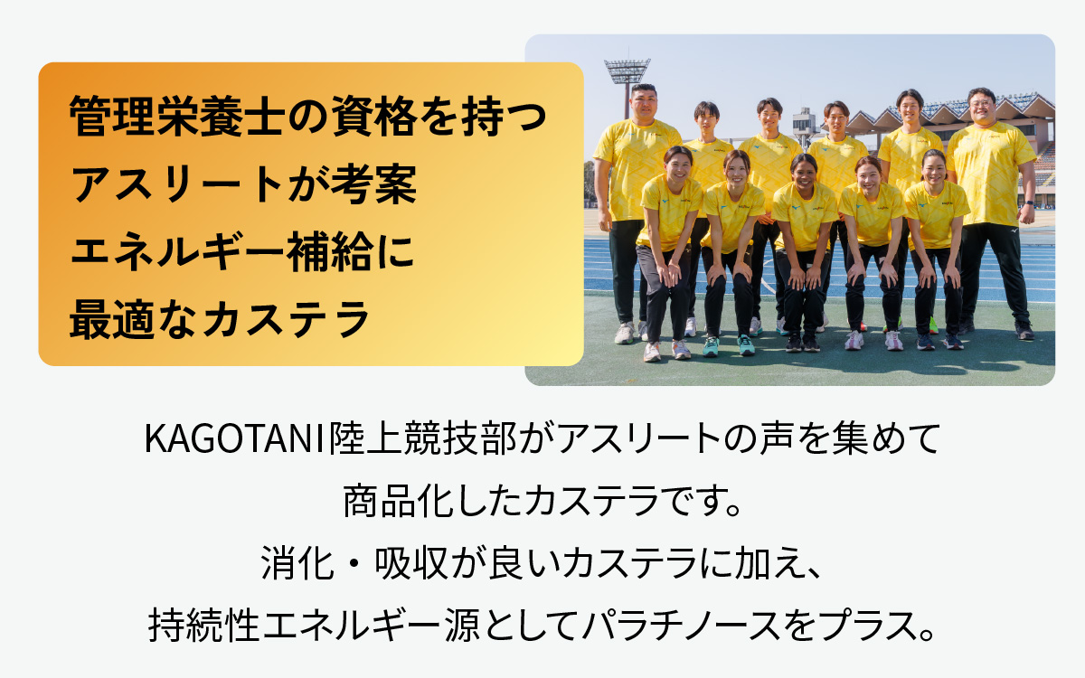 消化・吸収が良いカステラに加え、持続性エネルギー源としてパラチノースをプラス。エネルギーの持続性を向上。