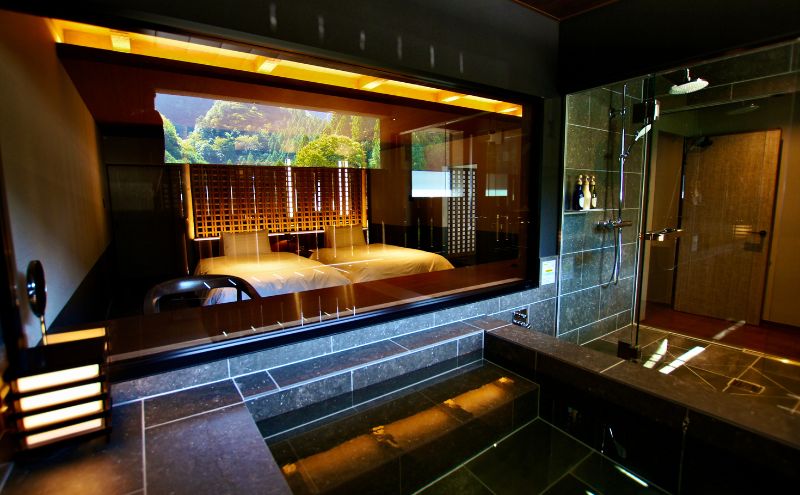 忍者が修行の合間に疲れを癒したと伝わる忍者ゆかりの温泉「隠れの湯」の源泉を有し、自然を目前に大浴場でご入浴いただきながら、癒しの時間が流れます。