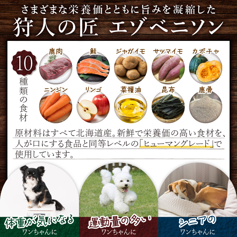 主原料にはエゾ鹿肉を使用し、さらにジャガイモ、鮭、カボチャ、サツマイモ、リンゴなど北海道の食材をふんだんにブレンド。