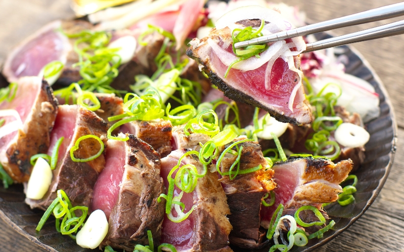 藁焼効果で生臭くなく女性にも高評価をいただいている藁焼鰹タタキです。