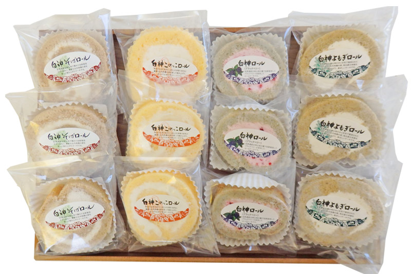 【白神よもぎロール】卵(国産)、生クリーム、砂糖、こめ粉(秋田県産)、牛乳、グラニュー糖、よもぎ、寒天、乳酸菌/甘味料(トレハロース)