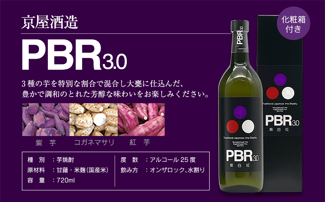 ・ムラサキマサリ(Purple)、コガネマサリ(Branc)、紅系芋(Rouge)、3種の芋を特別な割合で混合した大甕仕込み!!