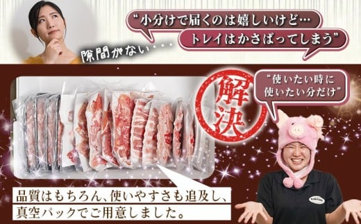 品質はもちろん使いやすさも追及し、お届けするお肉はすべて真空パックでご用意しました!とんかつ用に焼肉用、小間切れ・ミンチなど、色々なカットスタイルでバラエティ豊かにお届けします!