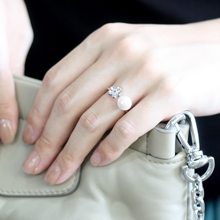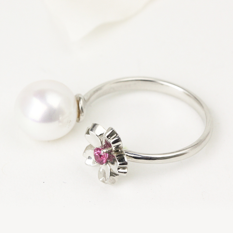 Pt和珠真珠&桜のルビー付フォークデザインリング
